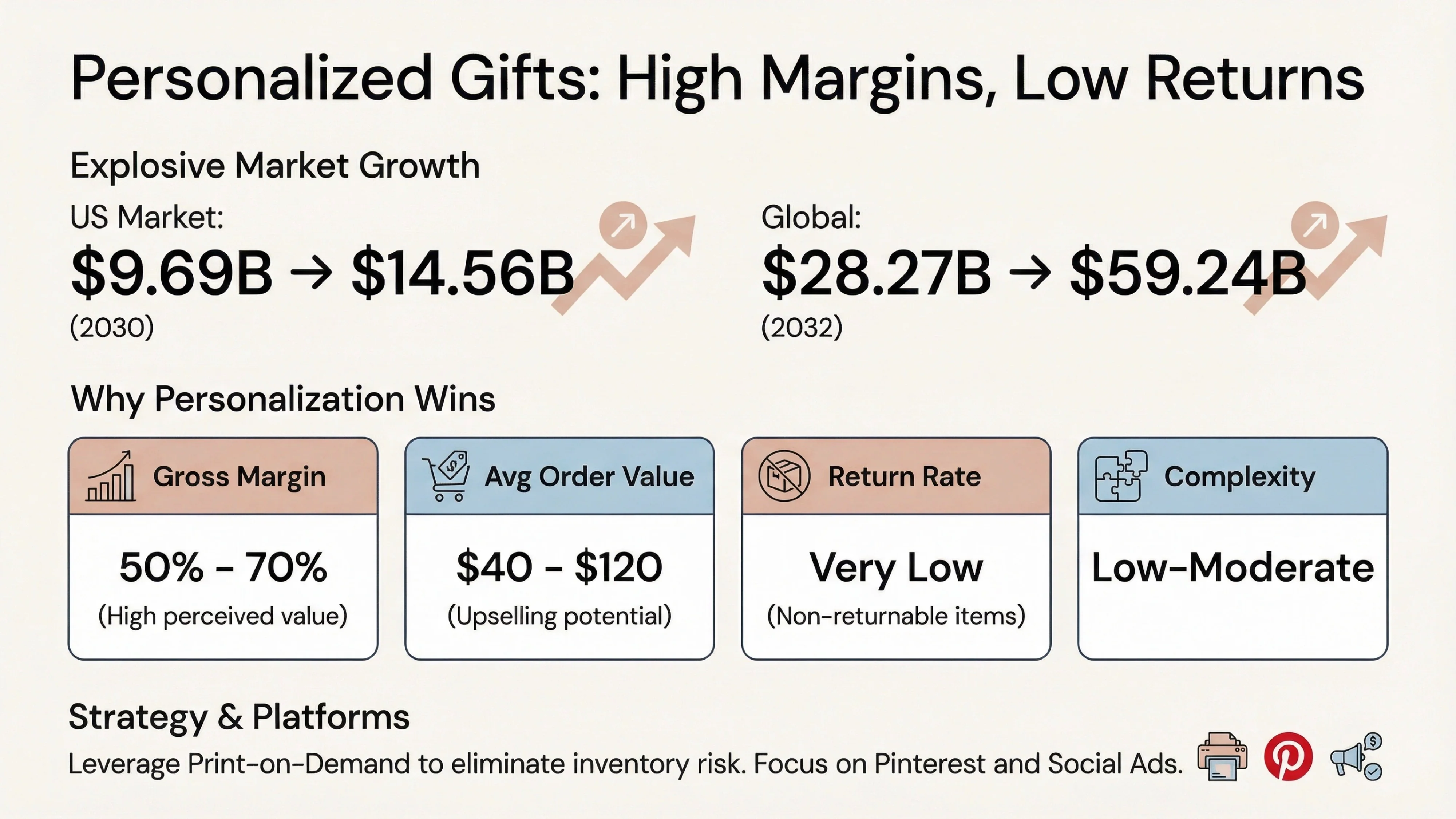 The US personalized gifts market is a rapidly growing $9.69 billion industry, expected to reach $14.56 billion by 2030 at a 7.03% CAGR [8]. Globally, the market is even larger at $28.27 billion, projected to reach $59.24 billion by 2032 [8]. Personalization adds significant perceived value, allowing for higher margins and very low return rates (since personalized items are typically non-returnable). This category is evergreen, with demand throughout the year for birthdays, holidays, and special occasions. Print-on-demand services make it easy to offer personalized products with no inventory risk.