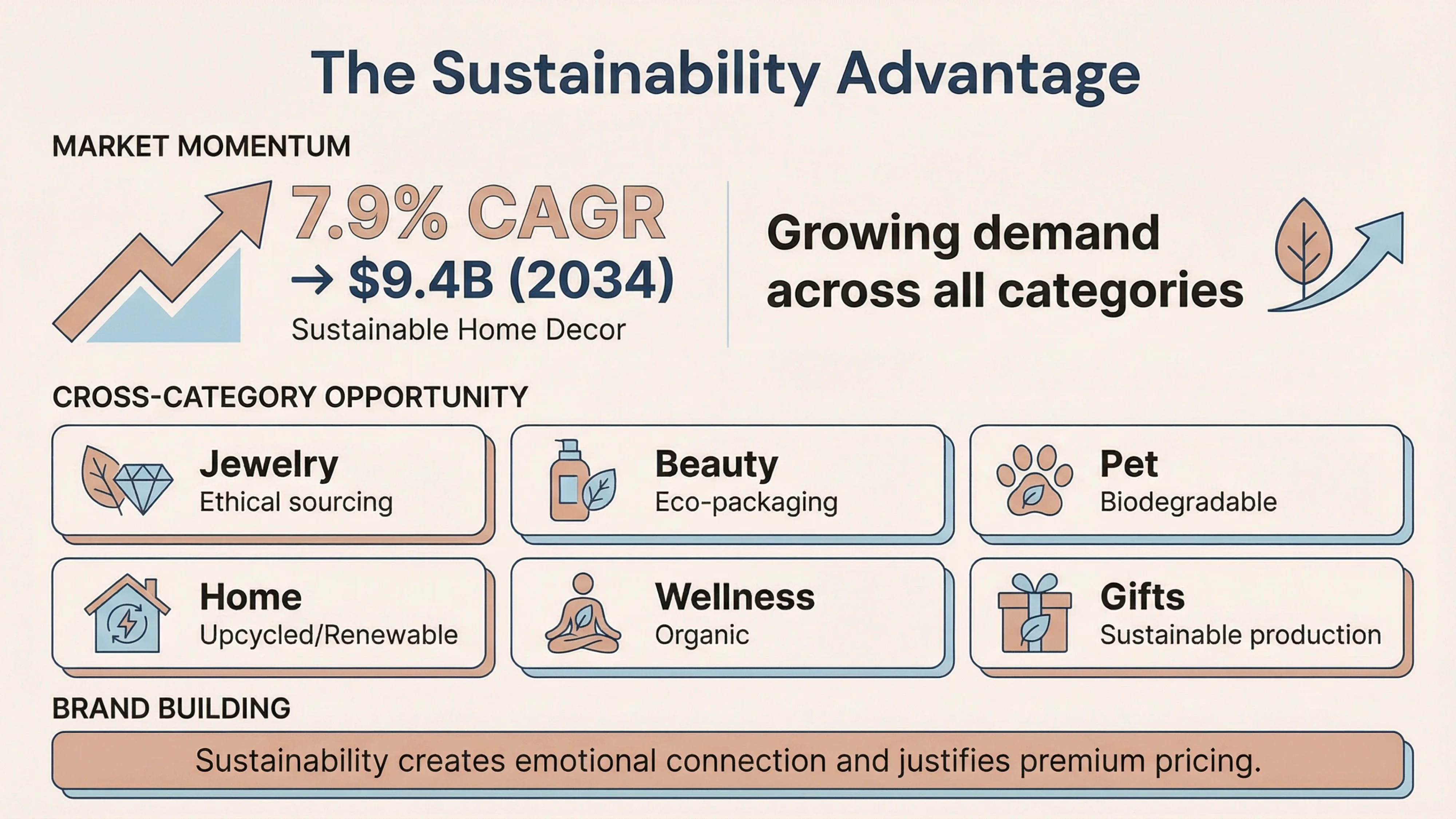 There is a growing consumer demand for sustainable and eco-friendly products across all categories. The sustainable home decor market alone is projected to grow at a CAGR of 7.9% to reach $9.4 billion by 2034 [7]. This trend extends to fashion, beauty, pet products, and household goods. Building a brand around sustainability can create a powerful connection with a passionate and growing consumer segment.
