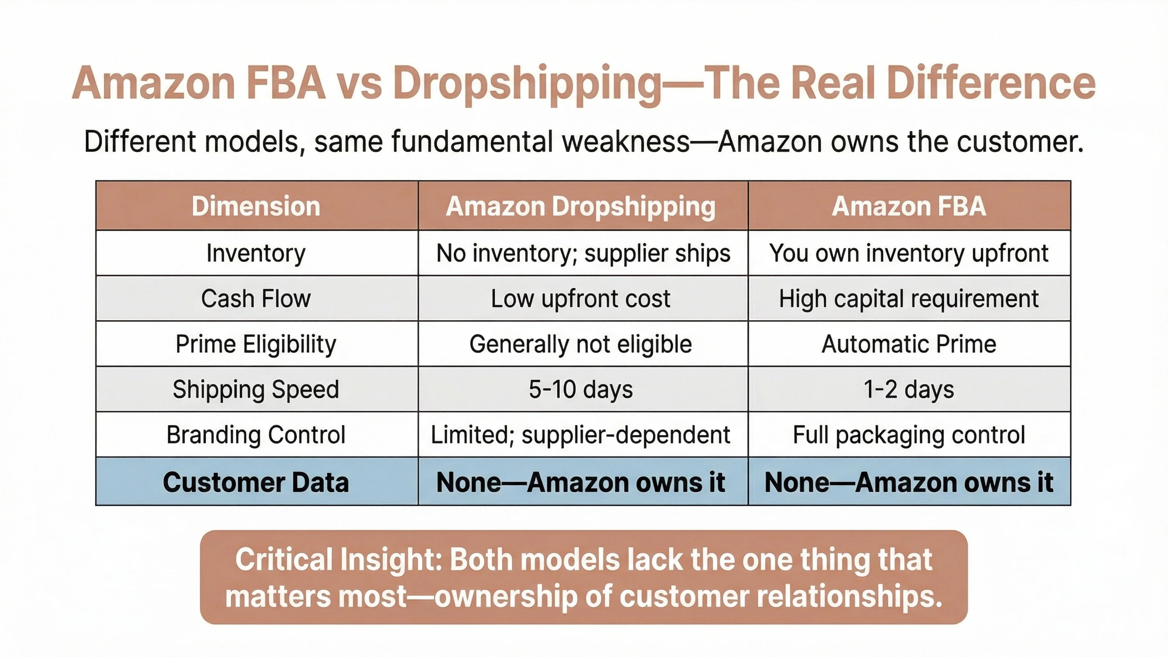 Amazon FBA requires you to purchase inventory upfront and ship it to Amazon's warehouses, where Amazon handles fulfillment. Dropshipping means your supplier ships directly to customers without you holding inventory. FBA offers Prime eligibility and faster shipping but requires more capital. Dropshipping has lower upfront costs but less control over fulfillment quality. Both models share the same weakness: Amazon owns the customer relationship, limiting your ability to build brand equity.