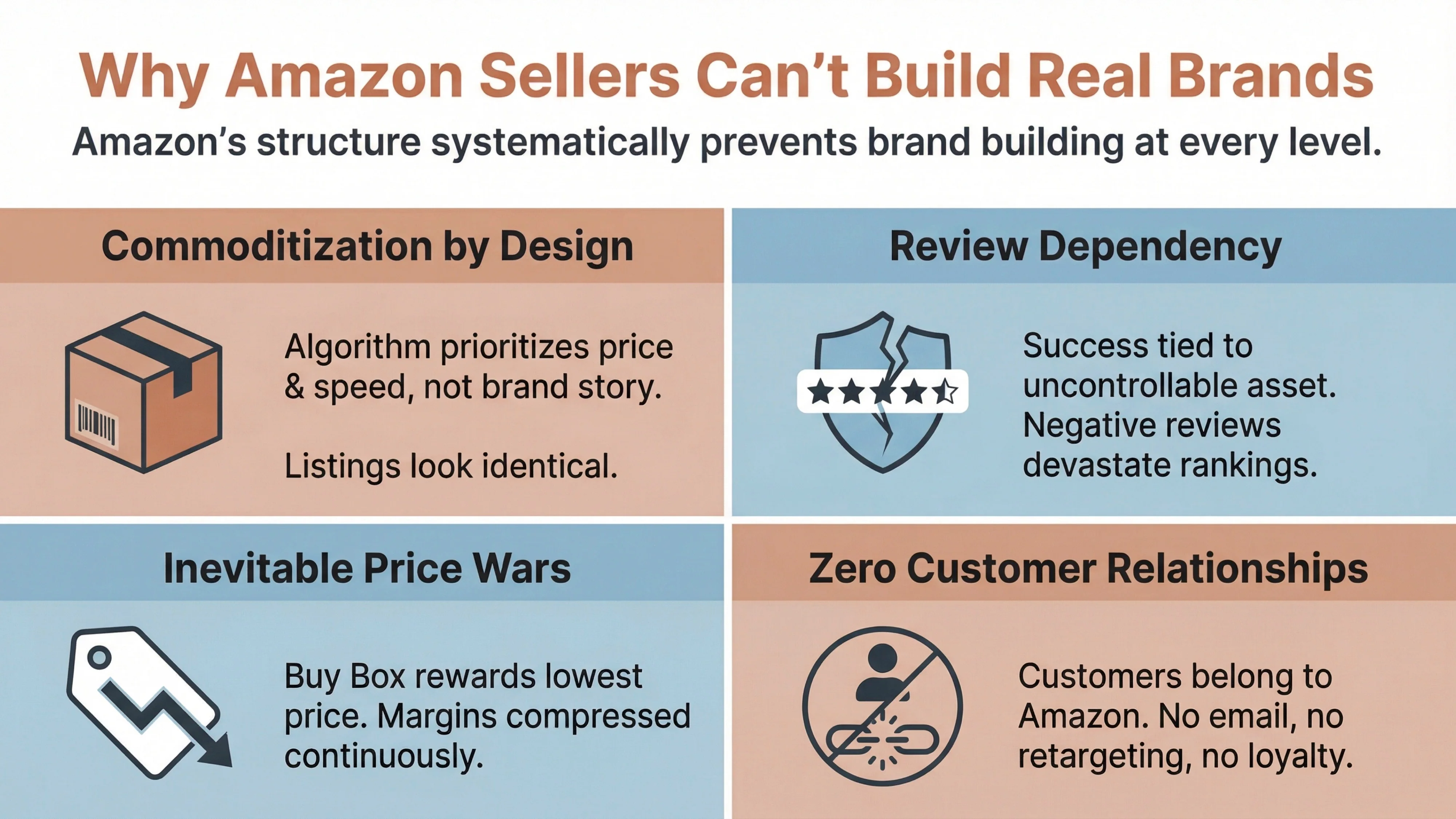 The structural limitations of Amazon's platform make it nearly impossible to build a true brand. While it's possible to generate revenue—even significant revenue—on Amazon, the economics and constraints of the platform work against brand building at every turn.